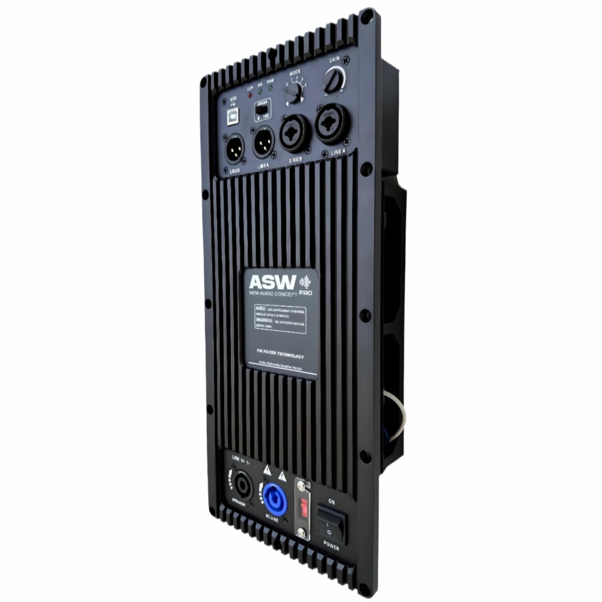 Este amplificador possui um canal de 2500W para SUBWOOFER e contém a tecnologia DSP (Digital Signal Processor) que faz todo o processamento do sinal de áudio com filtro FIR.